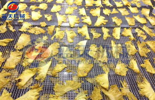 第三步:切好的菠蘿片進入熱泵烘干系統(tǒng)里烘干的過程,可以分成5段完成,第一段,烘干,不除濕,時間1.5個小時,內(nèi)外溫度一致,溫度50度,第二階段,溫度53度,開始連續(xù)除濕,除濕到40%,第三階段溫度58度,連續(xù)除濕,濕度26%,第四階段溫度55度,濕度20%,連續(xù)除濕,第五段溫度48度,濕度18%,連續(xù)除濕1小時,烘干完成。