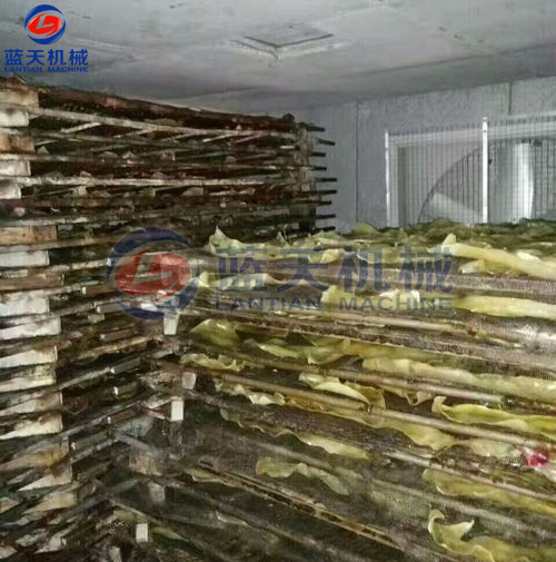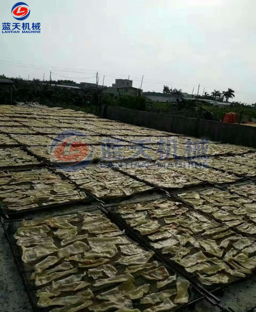 是利用太陽曬干的,整個過程需要持續(xù)四五天的時間,還需要工人在現(xiàn)場看管,但也避免不了蟲蟻灰塵的污染。如遇上陰雨天,豬皮曬干不及時就可能走味,給豬皮的干燥帶來諸多麻煩。