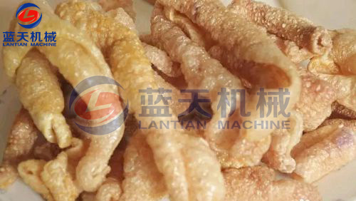 在油爆漲發(fā)前,豬皮需要在溫油中回軟,這是能否漲發(fā)的關(guān)鍵,油溫應(yīng)該掌握在40-50度左右,溫度高了也會影響漲發(fā)的程度,是否回軟達(dá)標(biāo)、視肉皮軟塌程度確定,這項操作標(biāo)準(zhǔn)在文字上無法準(zhǔn)確清楚表述,只有在加工過程中熟能生巧,最終生產(chǎn)加工經(jīng)驗是主要的。回軟后的待油爆肉皮應(yīng)該保持回軟狀態(tài)不能回硬,將鍋中油溫升到80度后即可將肉皮放入油鍋中,邊翻動邊加溫,油溫達(dá)到120度時豬皮就可以漲發(fā)好了,在漲發(fā)時油溫應(yīng)掌握好,不得過高,關(guān)鍵是保持不焦不老不黃的感官程度和完全漲發(fā)開的標(biāo)準(zhǔn),完全漲發(fā)后的皮肚,從熱油鍋內(nèi)撈出后應(yīng)當(dāng)控盡油脂并冷卻到常溫后方可包裝。不得未控盡油脂和降低溫度就進(jìn)行包裝,否則既影響包裝又影響產(chǎn)品質(zhì)量。
