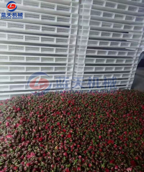 挑選后的鮮花蕾均勻的擺放在有鐵絲網(wǎng)底的網(wǎng)格盤內(nèi),花瓣統(tǒng)一向下或向上,厚度一致,勿擠壓;擺滿花蕾的網(wǎng)格盤裝車時要輕裝輕放,花蕾不能變形、磨損。
